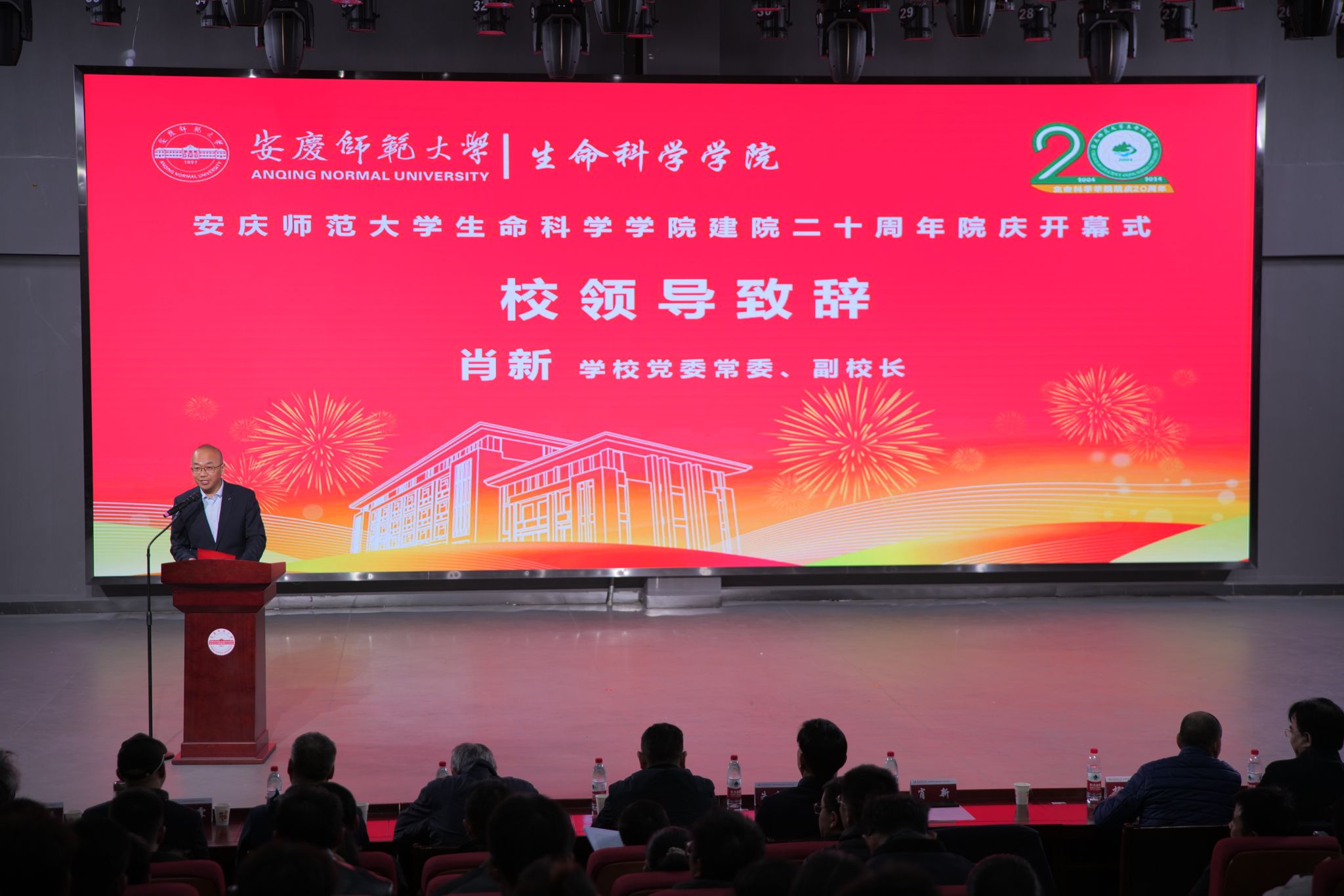 2024年11月23日,生命科学学院在传媒演播厅举办建院二十周年院庆暨生物多样性保护与特色资源利用学术论坛。学校党委常委、副校长肖新出席会议。安庆医药高等专科学校校长朱庆丰教授、南京师范大学杨光教授、中国科学院水生生物研究所何舜平研究员、中国科学院地理与湖泊研究所吴庆龙研究员、南开大学卜文俊教授、武汉植物园邱英雄研究员、中国中医科学院彭华胜教授和杰出校友代表周文良研究员等应邀出席会议,学院党政班子全体成员和曾经在学院工作过的老领导、部分校友以及全体教师和学生代表200多人参加会议。