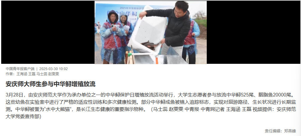3月28日,由安庆师范大学作为承办单位之一的中华鲟保护日增殖放流活动举行,大学生志愿者参与放流中华鲟525尾、胭脂鱼20000尾。这些幼鱼在实验室中进行了严格的适应性训练和多次健康检测。部分中华鲟成鱼被植入追踪标志,实现对洄游路径、生长状况进行长期监测。中华鲟被誉为“水中大熊猫”,是长江生态健康的重要指示物种。(马士蕊 赵雯雯 中青报·中青网记者 王海涵 王磊 视频提供:安庆师范大学党委宣传部)