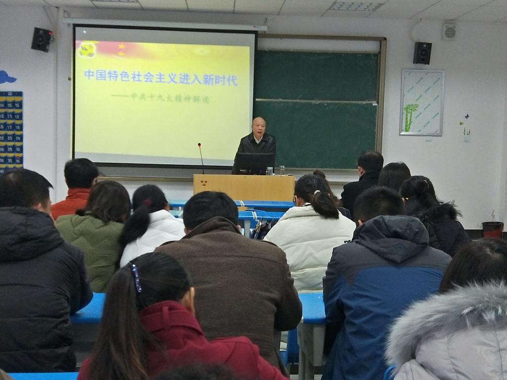 我院党总支书记吴甘霖以“中国特色社会主义进入新时代”为题概括了十九大召开的主要过程,以十九大的背景、框架、亮点、主要成果四大方面,多方位、深层次的向我们解读十九大精神。结合十九大主题“不忘初心,牢记使命”向我们反复强调了初心和使命的意义;“初心”既是为中国人民谋幸福,“使命”既是为中华民族谋复兴。随后,吴甘霖从七个方面介绍了十九大“亮点”,特别强调党建的总要求,坚持和加强党的全面要求、以党的政治建设为统领、以坚定理想信念宗旨为根基、调动全党积极性、主动性、创造性为着力点,全面推进党的政治建设、思想建设、组织建设、作风建设、纪律建设,把制度建设贯穿其中。