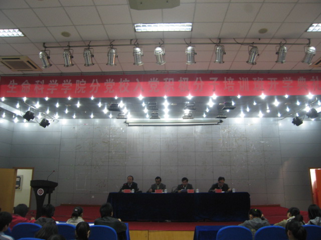 2010年11月3日下午,“生命科学学院分党校第九期入党积极分子培训班开学典礼”在菱湖校区学术报告厅隆重举行。安庆师范学院党委组织部部长陈光明同志,校党委委员、生命科学学院党总支书记、分党校校长刘友忠同志,生命科学学院院长吴甘霖同志、党总支副书记朱庆丰同志和部分老师以及生命科学学院入党积极分子参加了此次开学典礼。生命科学学院院长吴甘霖同志主持了这次开学典礼。