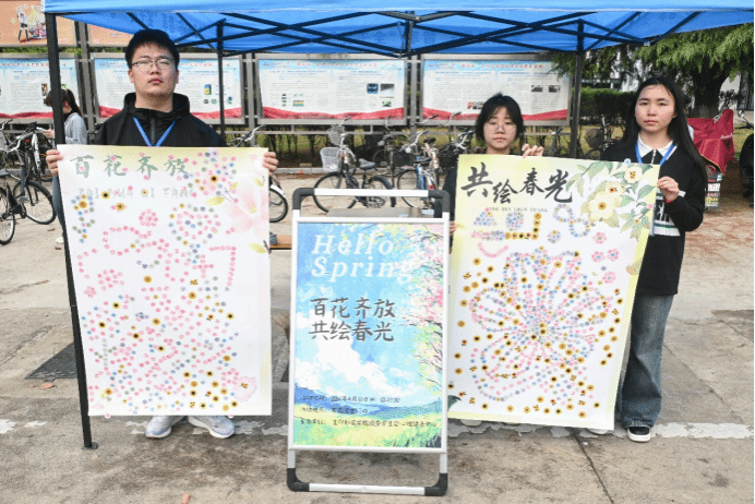 揭下贴纸,抚平纹路,伴随着间或的交流声,一朵朵拼贴花绽放在平滑的展板上。4月13日,生命科学学院在东苑食堂门口开展“百花齐放,共绘春光”拼贴画活动,学生们用一张张精美的花卉贴纸,在展板上“复刻”春日花开千万朵的美丽景象。