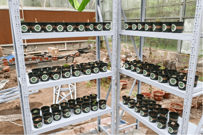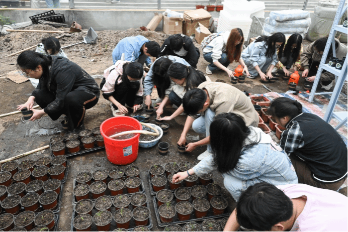 铲取适量培养土、接取足量清水灌溉、将姓名写下贴在盆身……在“流水线”式的种植流程中,一盆盆崭新的盆栽整齐排列在大棚内的置物架上,静待生长开花。“春季为生长季,要灌满足够的水。被子植物的根系对温度感知敏感,夏季不能浇水。”种植期间,翟伟向学生们分享着春夏灌水的经验。