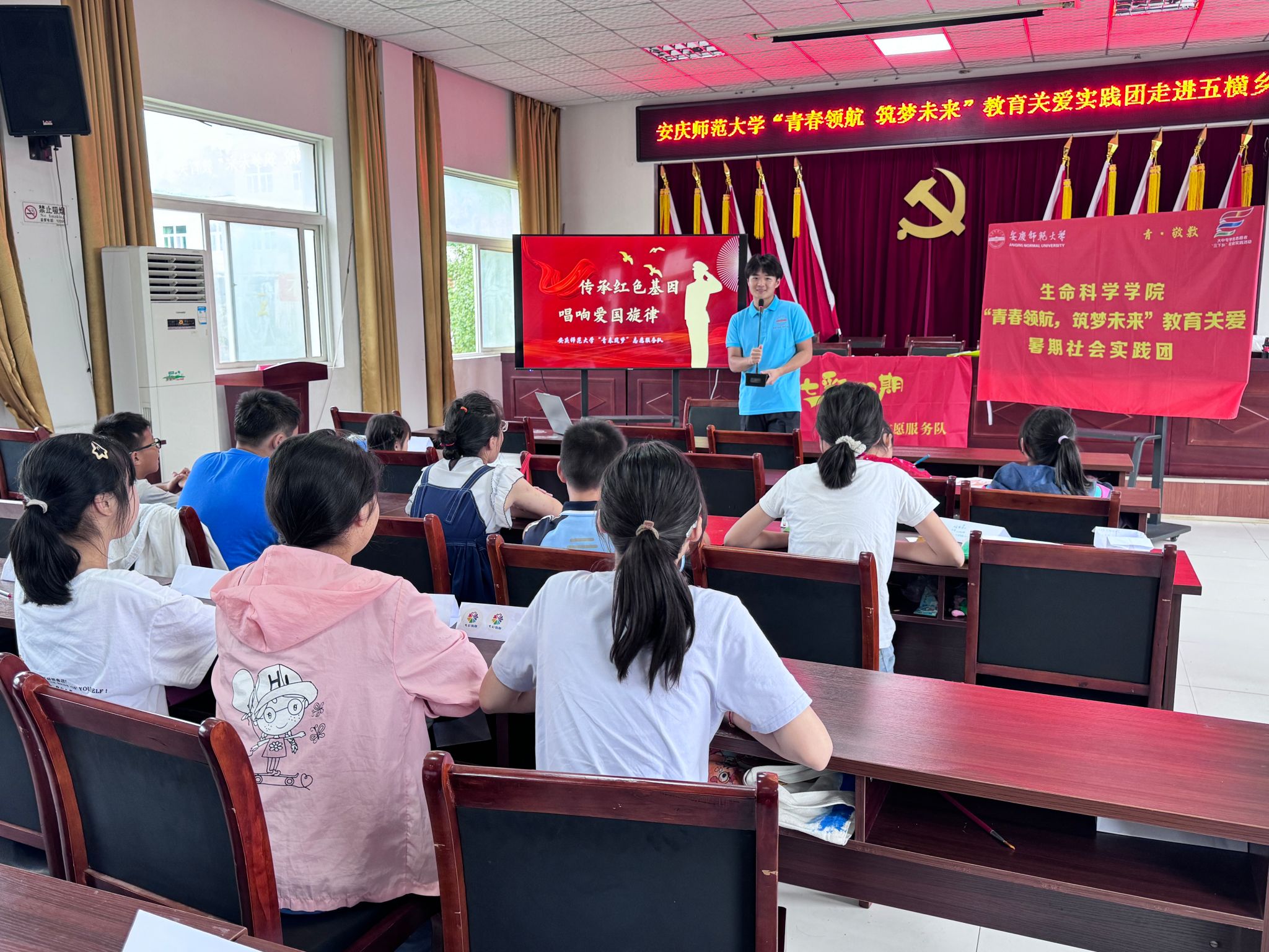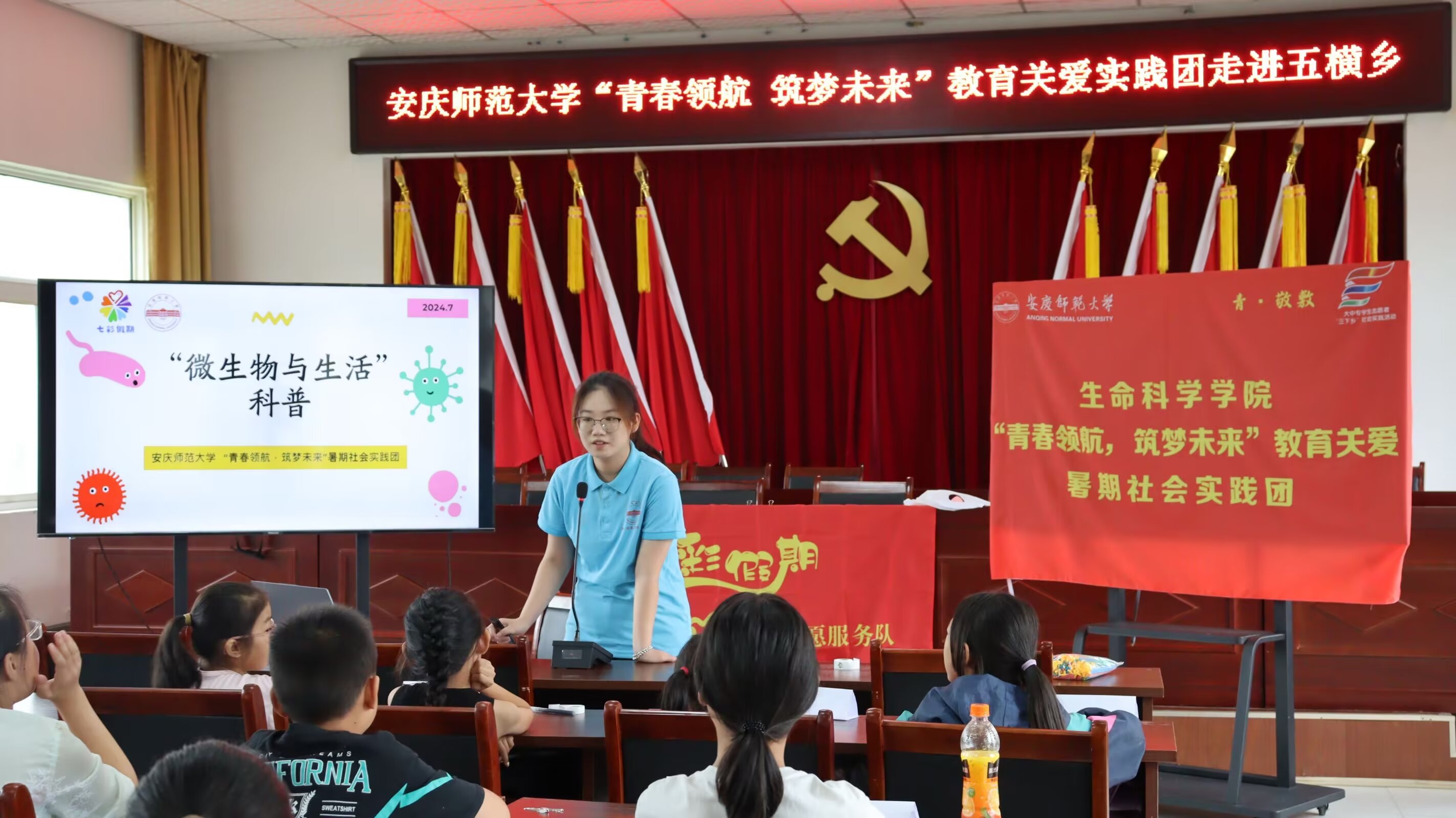 近日,生命科学学院“七彩假期”志愿服务队前往安庆市五横乡中心小学开展为期10天的教育关爱实践活动。成员们立足专业特色,开展思想引领、科学教育、创意手工、知识讲堂、美育养成活动,为50余名小学生带去丰富的文化知识体验,筑梦孩子们的七彩童年。