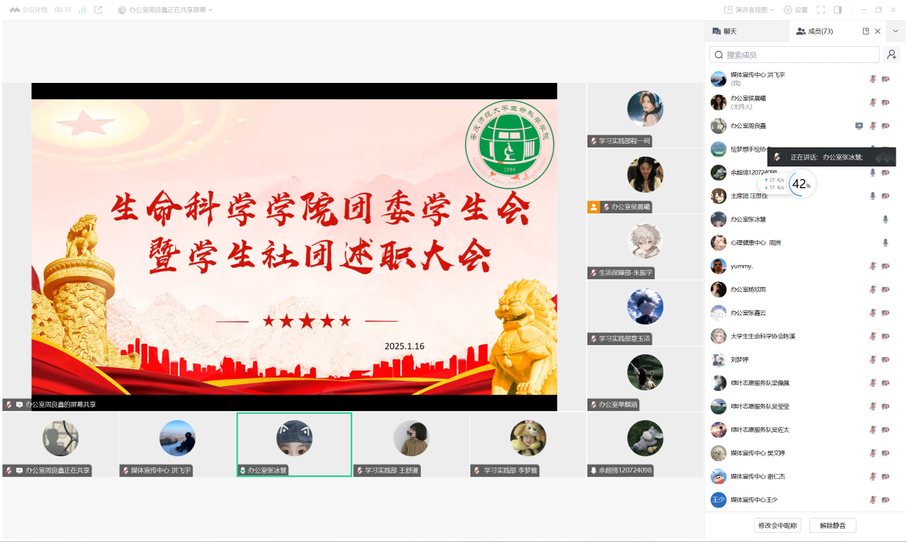 1月17日,生命科学学院线上召开2024年度学生组织述职评议会议。院团委负责老师及各学生组织负责人参加述职评议大会。