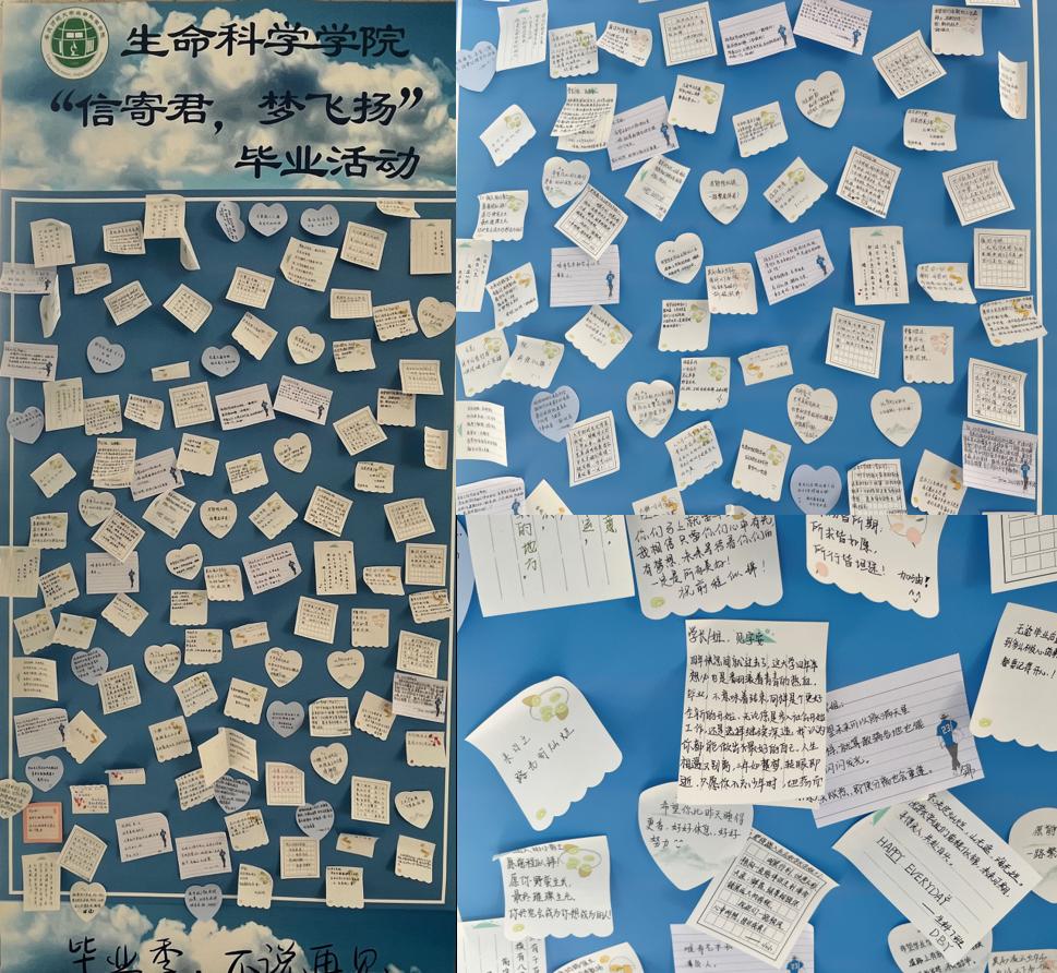 “试炼的终点是花开万里”“愿你们不彷徨不迷茫”“祝学长学姐们前程似锦,未来可期”……展牌上贴满了各式各样的便利贴。5月17日至22日,生命科学学院举办“信寄君,梦飞扬”活动,陆续有四百余名学院学生为学院毕业生送上自己的暖心祝福。