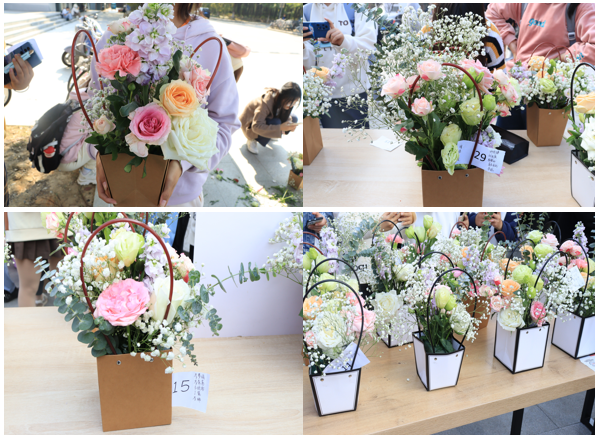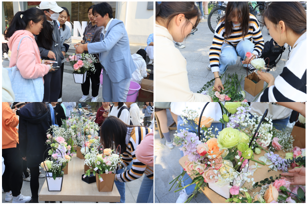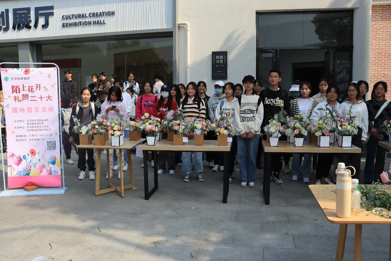 “大荔枝”“洋桔梗”“紫罗兰”“尤加利叶”…… 11月9日中午生命科学学院在东苑食堂门口举办“陌上花开,礼赞二十大”的插花活动,进一步落实《生命科学学院2022级新生“1+3+N”模式入学教育实施方案》,加强美育教育,用插花作品表达对党的美好祝愿。活动吸引了近200名学生参与。