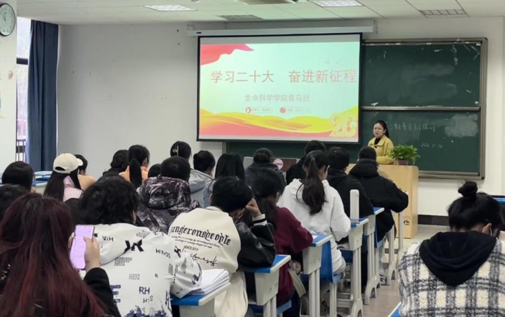 11月18日,生命科学学院青马班在G107开展党的二十大精神专题学习会,此次学习会由团委负责老师徐启凤做主题宣讲。