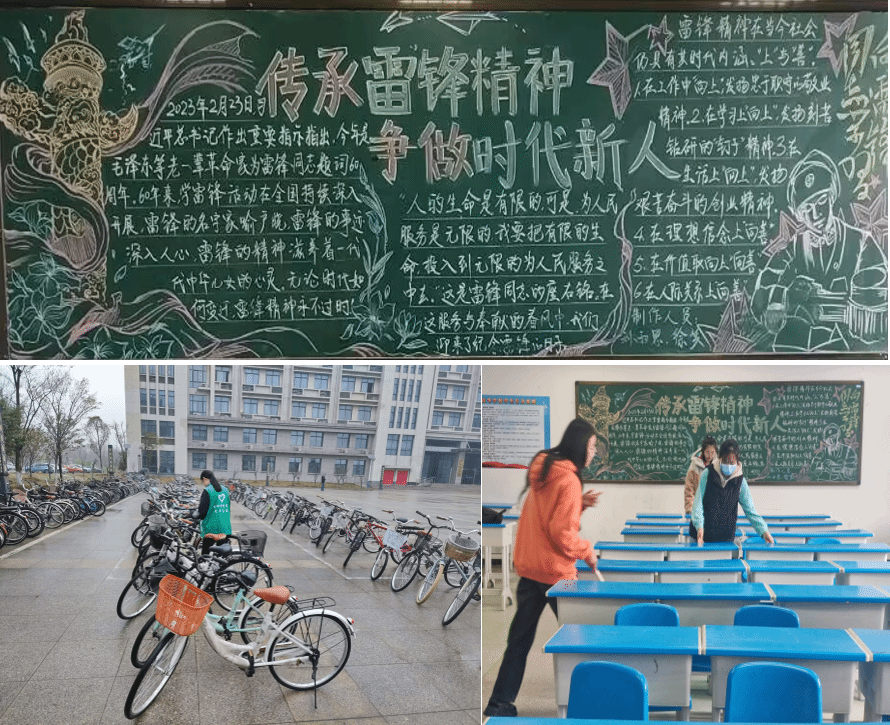3月20日至22日,生命科学学院各班级手绘雷锋精神主题黑板报,一笔一画表达对雷锋精神的敬仰,擦黑板、摆桌子、清扫垃圾……同学们干劲十足,享受着劳动所带来的快乐。另一边,在学院的自行车停放点也有一群身着绿色志愿服的志愿者在整理摆放自行车。扶起倒下的自行车,将自行车移放在正确区域,志愿者身着绿色马甲,在细雨中摆放自行车,绿色的志愿服为学院增添了春天的色彩,整齐的自行车也让学院环境更加整洁明亮,不少路过的学生戏称志愿者们为“家门口的雷锋”。