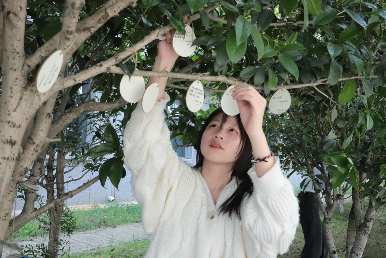 此外,学院门口的桂花树更是化身成学生心目中的“心愿树”,承载着学生的“满满心意”。生物科学专业2021(4)班的瞿佳蕊挂上了一个心愿牌,上面特意画着“考研喷雾”。她表示,她常常会看到学长学姐在学院里背书,希望心愿牌可以带来好运气,为“考研人”带来好消息。“学长学姐在路过的时候看到,也能够带着好心情进入备考状态。”
