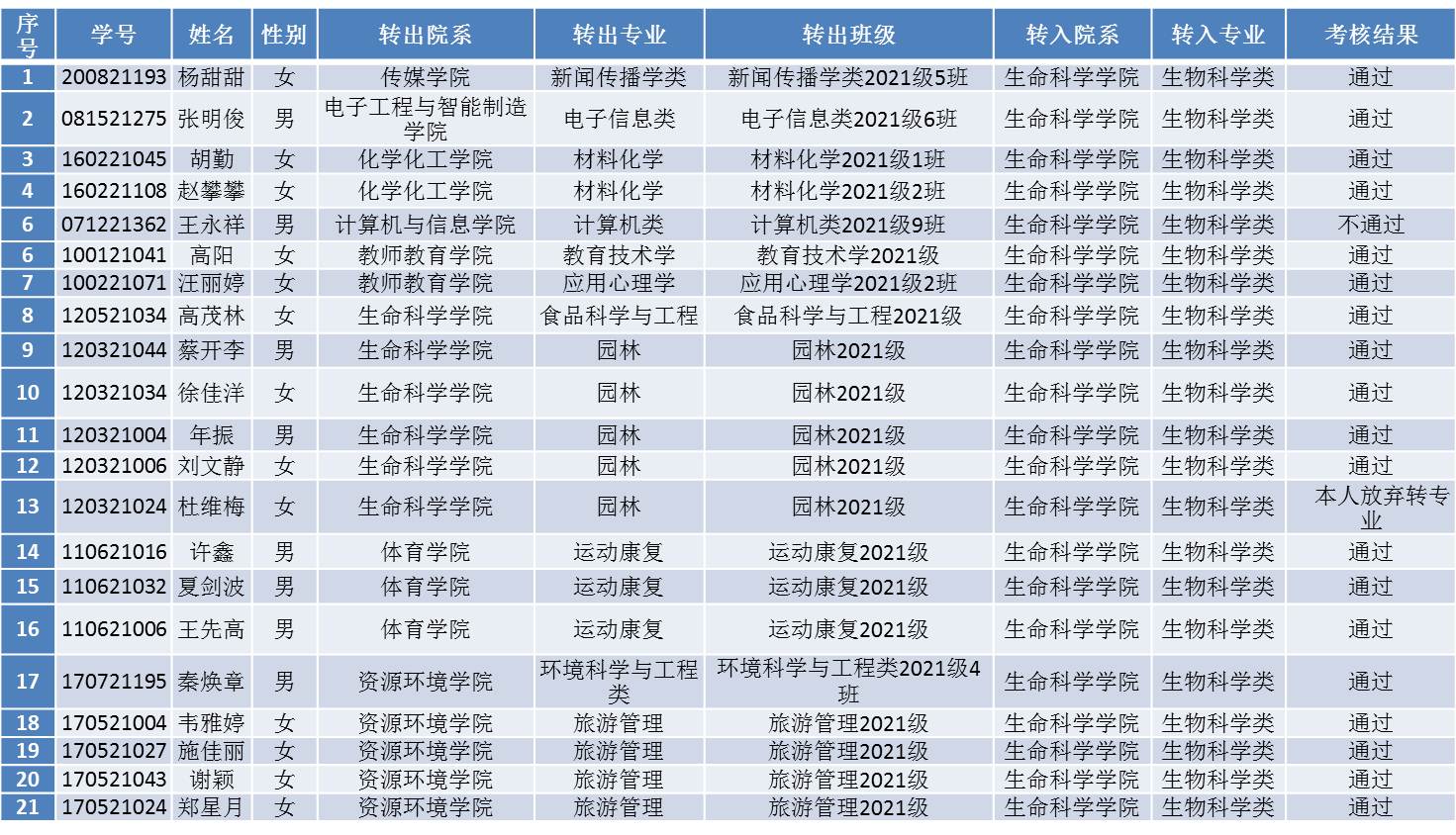 根据《安庆师范大学全日制本科学生转专业管理办法》(校政字[2021]20号)文件和生命科学学院转专业工作方案,2021年12月15日(星期三)下午,生命科学学院转专业考核工作组,本着公开、公平、公正的原则,在纪委监督下,对申请转入生命科学学院的21名同学(其中拟转入生物科学类21人)进行了面试。现将生命科学学院2021-2022学年转专业学生考核结果公示如下:
