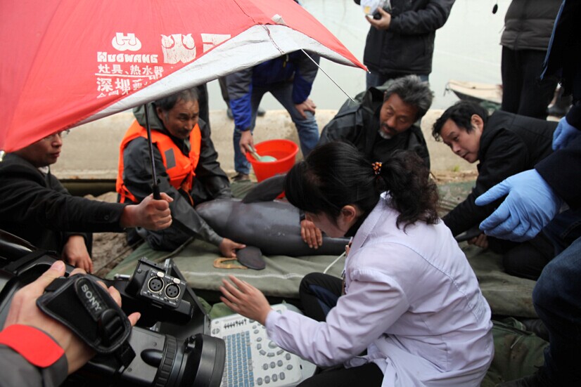 12月9日,安庆师范学院淡水生态所与市农委渔业局一起对江豚进行全面健康检查,并邀请南京师范大学杨光教授和安庆海军116医院专家参加。本次体检目的有3点:① 了解个体生长发育状况,为大规模江豚迁地保护提供基础数据;② 了解母豚妊娠状况,制定相应保育措施;③ 建立个体遗传谱系,是江豚迁地保护防止近亲交配的基础工作。