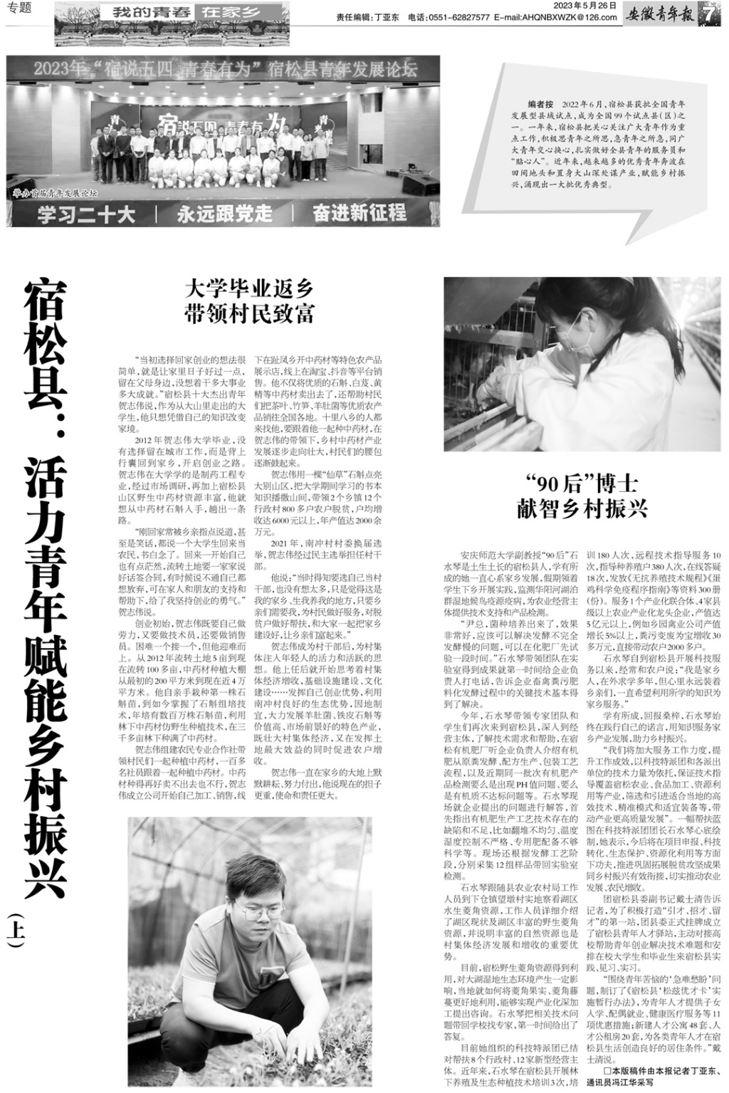 近日,安徽青年报专题报道了我校青年教师石水琴博士献智宿松乡村振兴的先进事迹(http://epaper.ahyouth.com/index.php?CurrPeid=2235&CurrSid=21338)。