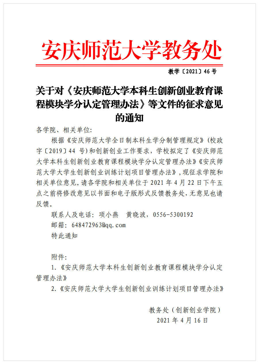 关于对《安庆师范大学本科生创新创业教育课程模块学分认定管理办法》等文件的征求意见的通知