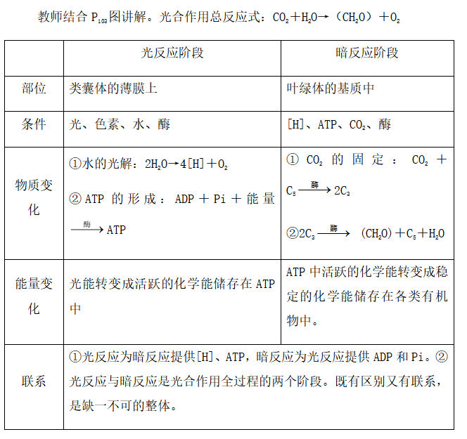 ⑴ 通过由浅入深的讲解,让学生理解光反应和暗反应的过程,区别和联系。