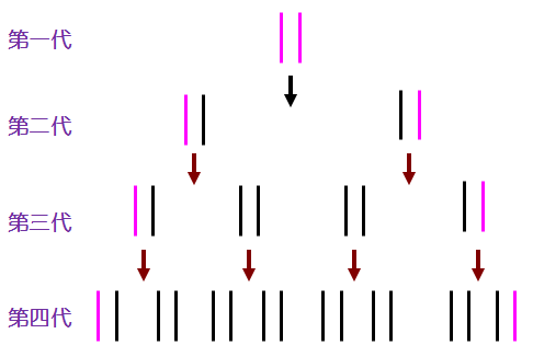 如果最初的DNA的链我们用红色表示,新合成的链都用蓝色表示,你能设想得到的DNA分子可能是什么样子?