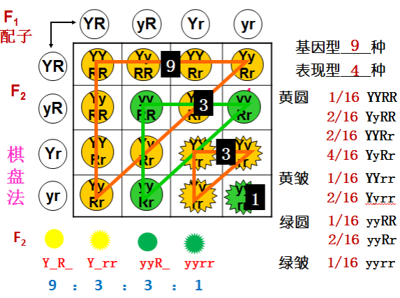 F2代出现四种性状表现,黄色圆粒315粒,黄色皱粒101粒,绿色圆粒108粒,绿色皱粒32粒,其比例接近9:3:3:1。