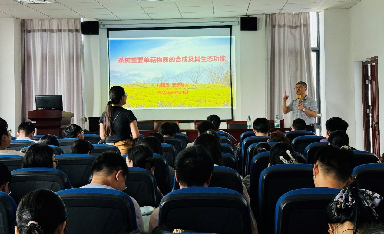 5月24日,中国农业科学院茶叶研究所付建玉研究员应邀来我校交流指导,并作题为“茶树重要单萜物质的合成及其生态功能”的学术报告。报告由生命科学学院副院长穆丹教授主持,学院部分老师、研究生及本科生聆听了报告。