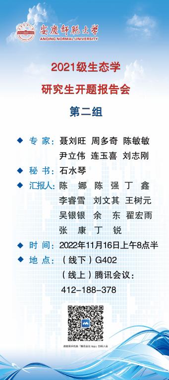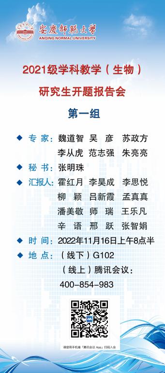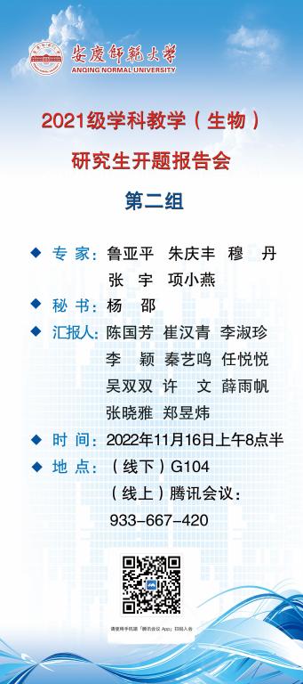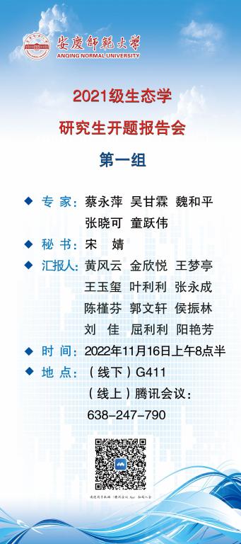 拟定于2022年11月16日上午八点半进行安庆师范大学生命科学学院2021级生态学及学科教学(生物)专业开题报告会,报告会形式采用线上线下结合方式进行。