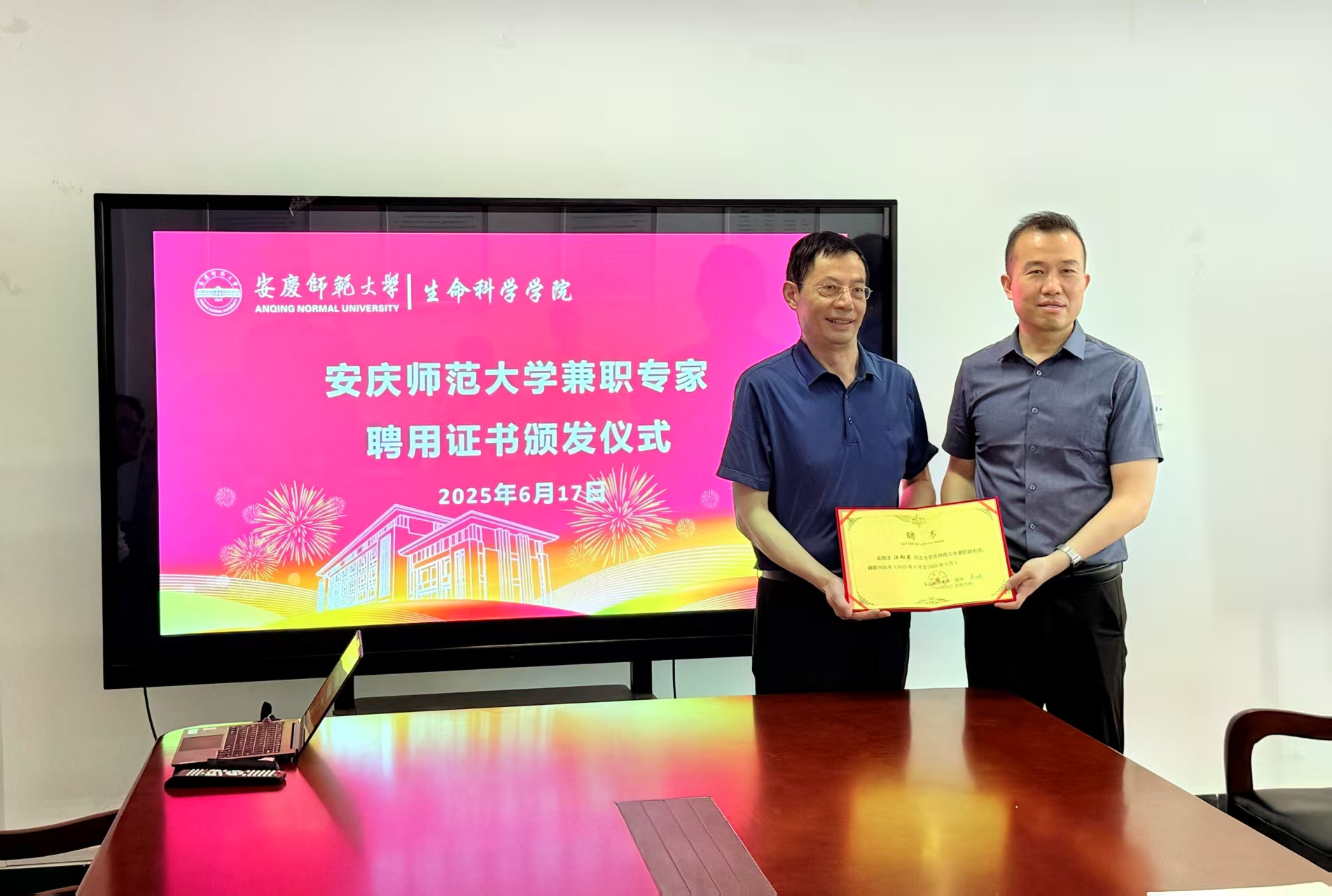 报告会后,学院举办了安庆师范大学兼职专家聘用证书颁发仪式,由吴彦院长主持,聘请汪向东所长为安庆师范大学兼职研究员。