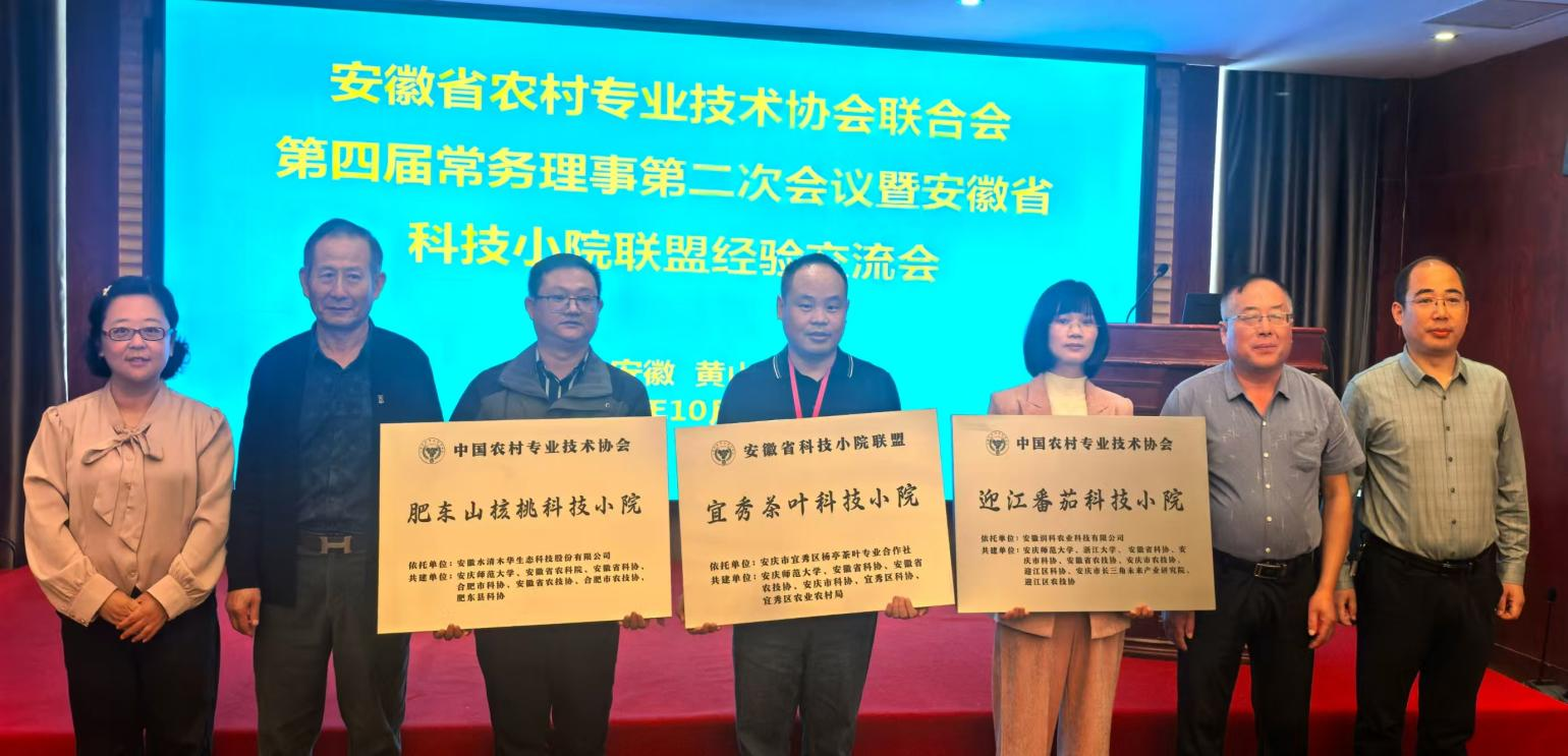 交流会上,对中国农村专业技术协会同意设立的安徽省30家科技小院进行了授牌仪式,其中,由我校牵头建设的“安徽肥东山核桃科技小院”和“安徽迎江番茄科技小院”被授予国家级科技小院、“安徽宜秀茶叶科技小院”被授予省级科技小院。这是我校首次获批2个国家级科技小院和1个省级科技小院,是校深化人才培养改革、精准服务地方产业发展的新突破,成为学校服务大别山革命老区振兴“产教融合样板”。