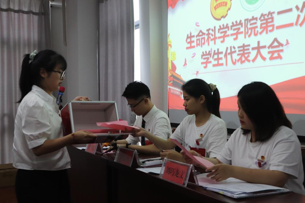 大会听取审议《安庆师范大学生命科学学院第二次学生代表大会提案工作报告(草案)》,通过了《安庆师范大学生命科学学院学生会章程(修正案)》、《安庆师范大学生命科学学院第二届学生会主席团选举办法(草案)》、《安庆师范大学生命科学学院第二次学生代表大会总监票人、监票人名单(草案)》,并通过民主投票选举出新一届学生会主席团成员、院学生委员会委员和校学生代表大会代表。