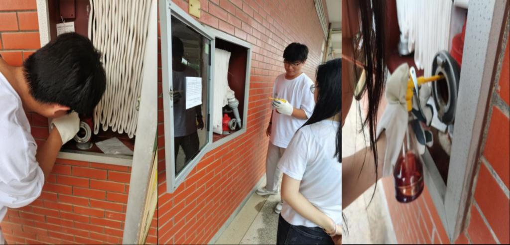 学生在对图书馆消防栓进行整理