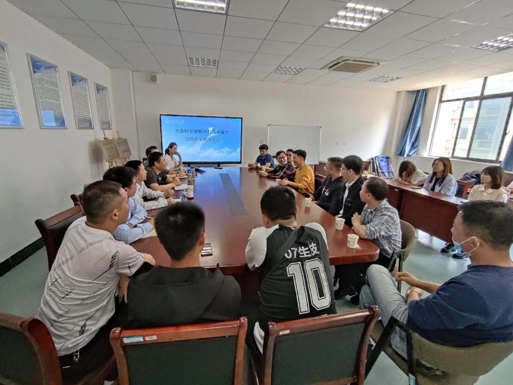 暮春的龙山校区,鹅公山下,郁郁葱葱,生机盎然,双龙湖畔,微风拂面,美景醉人。2021年5月2日,生命科学学院2011届校友相聚安庆师范大学,举办了毕业十周年返校活动。是日上午,2011届校友向生命科学学院赠送了纪念礼物,并在生科楼411会议室举办师生座谈会。学院党委书记朱昌流、院长周多奇、副院长吴彦、副书记张辉、辅导员曹勇、毕业校友和在校生代表共计30余人参加了座谈会。座谈会由朱昌流主持。